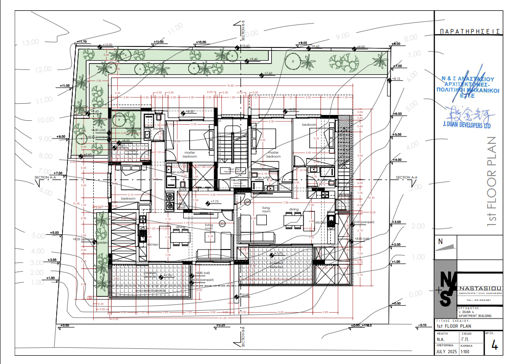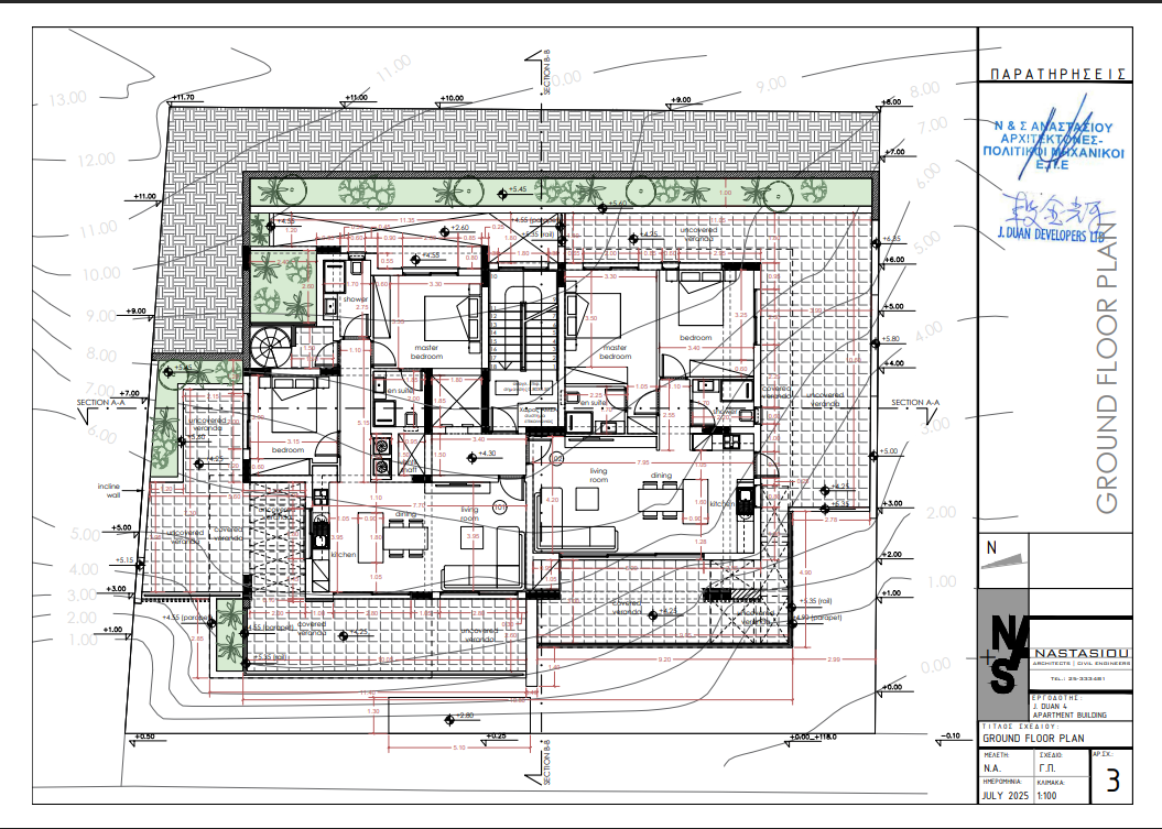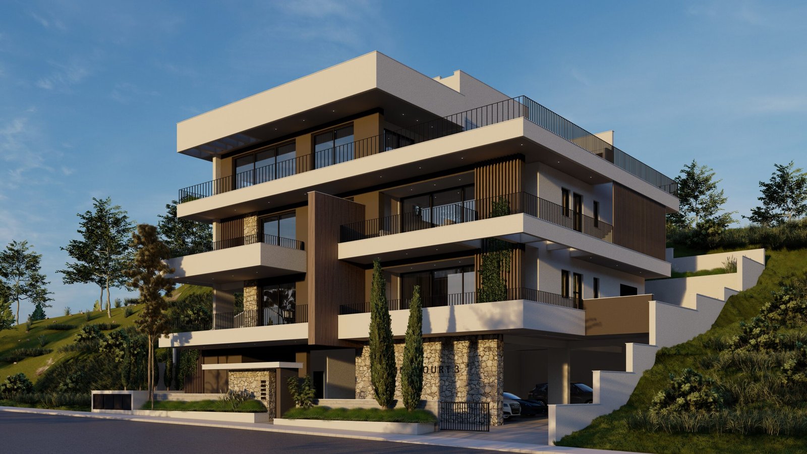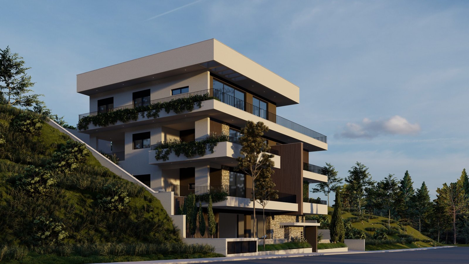 Anna Court 3 is a boutique apartment building of just five homes, set on a green hillside in Agios Athanasios. Strong horizontal lines, warm wood details and deep verandas give the building a calm, modern character that sits naturally in the landscape.